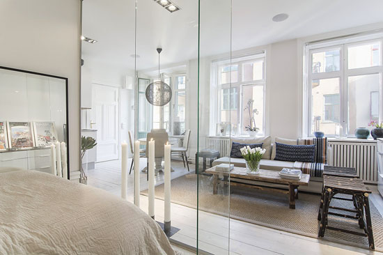 只有34平方米但是整个房间展示出了不一样的情趣,巧妙地运用了玻璃将房间分隔开来,开放式的格局,新颖独特,精巧的设计就是如此让人着迷。整体看上去,该公寓确实小巧精致,玻璃隔断的卧室为房间增亮许多。